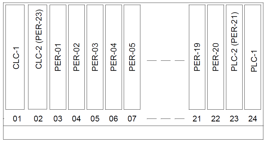 Если в модуле отсутствует CLC-2 или PLC-2, в слоты 02 и 23 может быть установлена периферийная плата. Максимум 22 слота для периферийных плат (704 аналоговых порта).