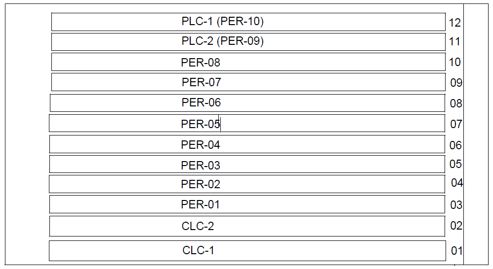 В корпусе MLCAA есть 24 слота. Первых два слота равноценны и предназначены для включения CLC. Остальные слоты являются универсальными и служат для установки как периферийных плат, так и плат электропитания PLC, однако, из-за охлаждения платы электропитания устанавливаютсявсегда в последние слоты.